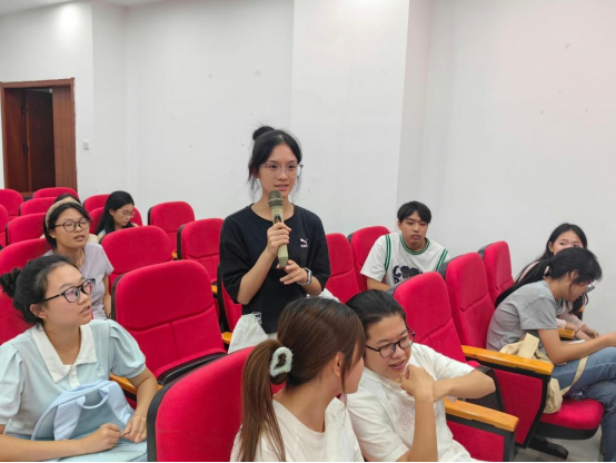 互动环节将现场气氛推向高潮。新生团员代表提问:“如何让理论学习更贴近实际?”青马班学员马胭回应:“可以结合专业特色开展实践,比如我们广编专业,就能深入基层采访,用镜头讲述真实的故事。”另一名学员孙雪娥补充道:“内容应突出时代感,像对比父辈的奋斗历程,能让我们更直观感受时代的进步与青年的责任。”余玲玲老师点头赞许:“理论学习不能‘空对空’,要‘实打实’,把书本知识转化为服务社会的行动。”