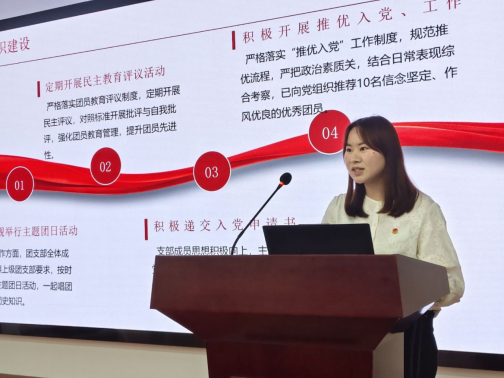 展示环节结束后,余玲玲老师在总结发言中对各参赛支部的精彩表现给予肯定。她指出,基层团支部建设是学院人才培养的重要组成部分,希望各支部再接再厉,充分发挥模范带头作用;同时号召全院团支部以先进为榜样,对标五星标准,补齐工作短板,创新工作方法,不断提升组织力、引领力、服务力,引领广大团员青年坚定理想信念、锤炼过硬本领,为学院发展和社会进步贡献青春力量。