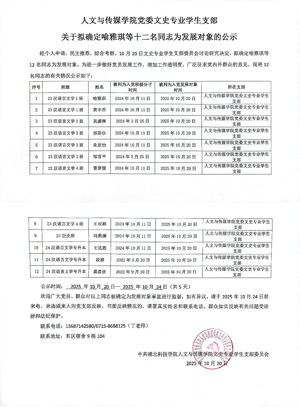 167net必赢,必赢手机app党委文史专业学生支部关于拟确定喻雅琪等十二名同志为发展对象的公示