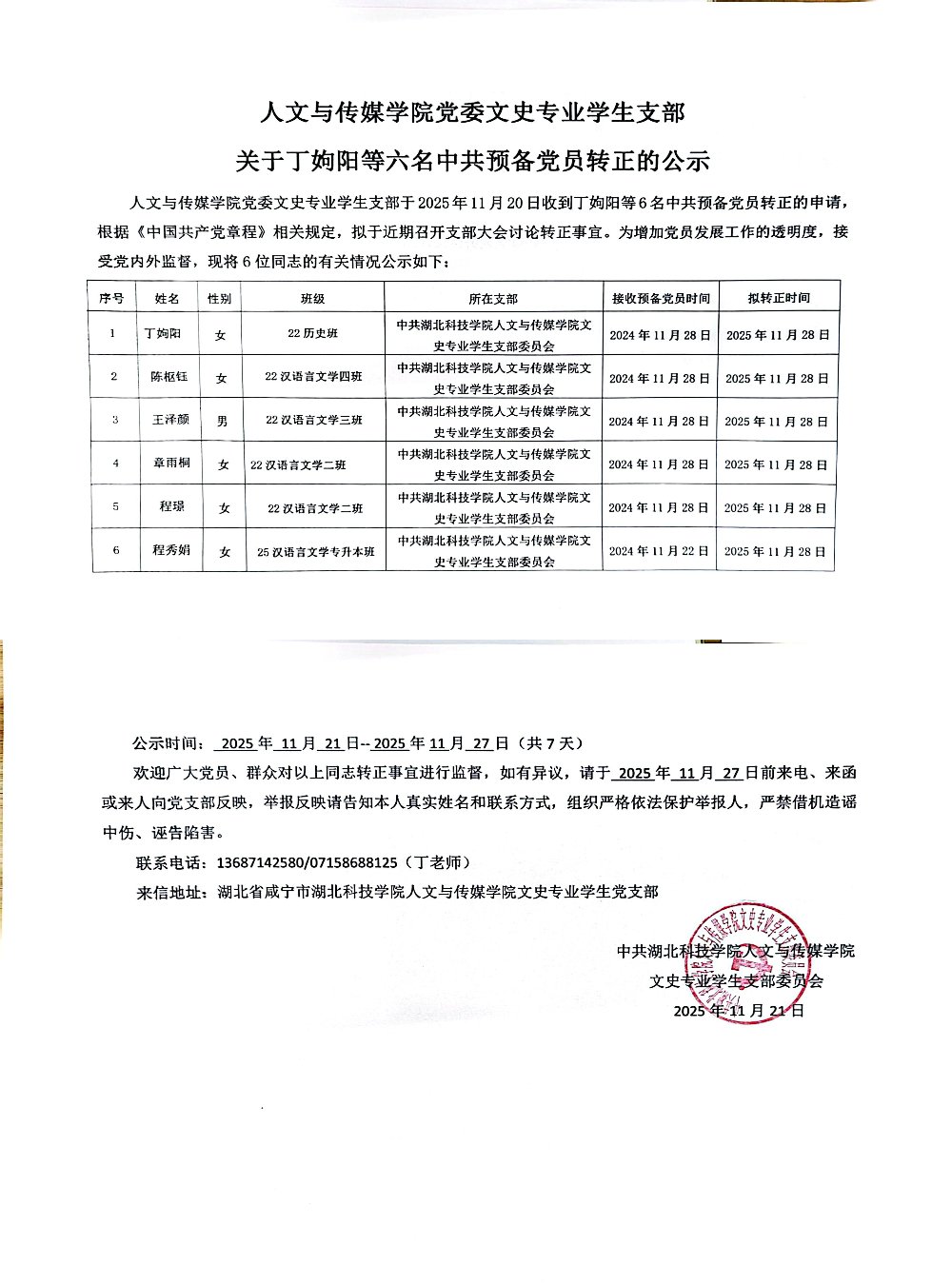 167net必赢,必赢手机app党委文史专业学生支部关于丁姁阳等六名中共预备党员转正的公示