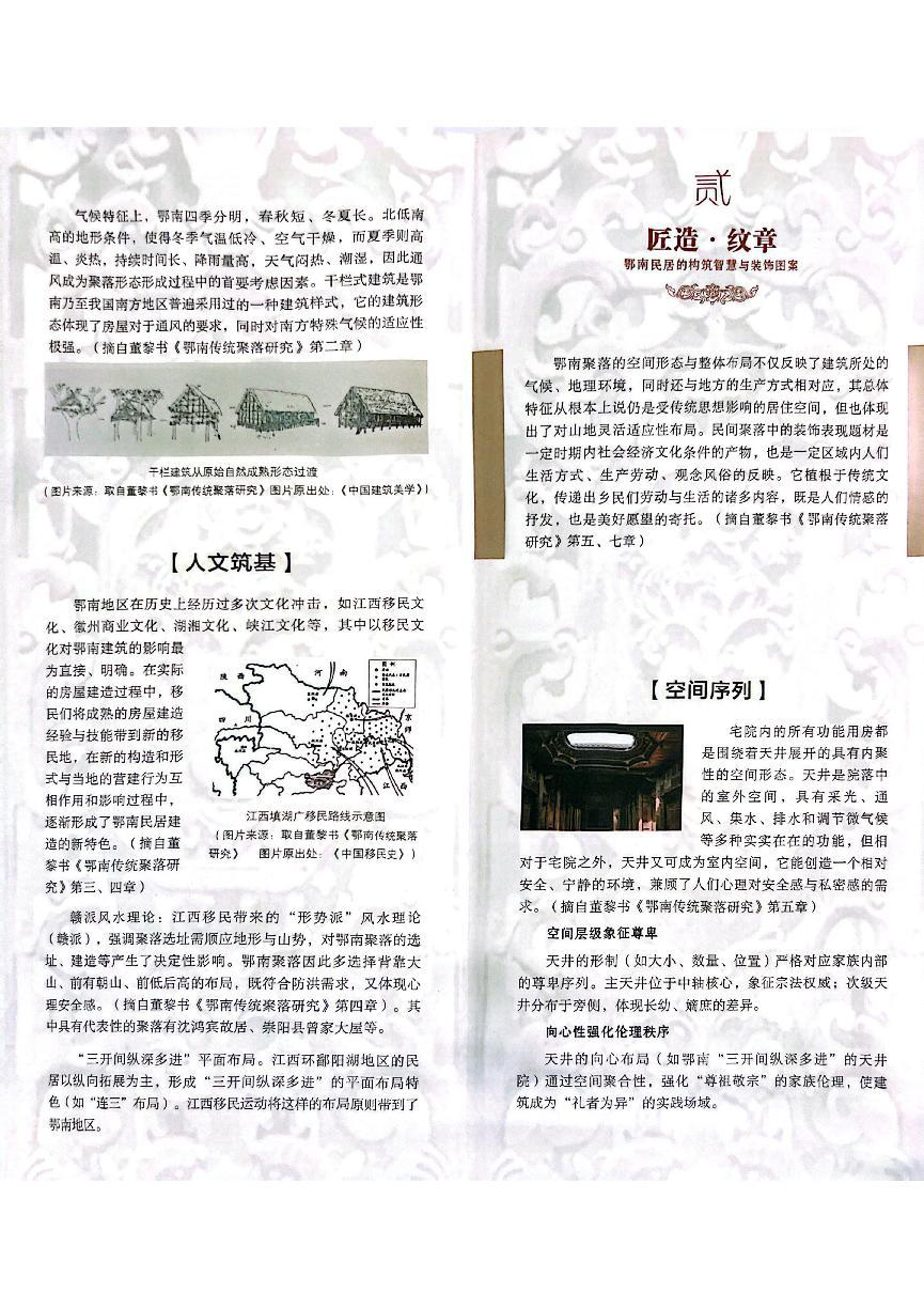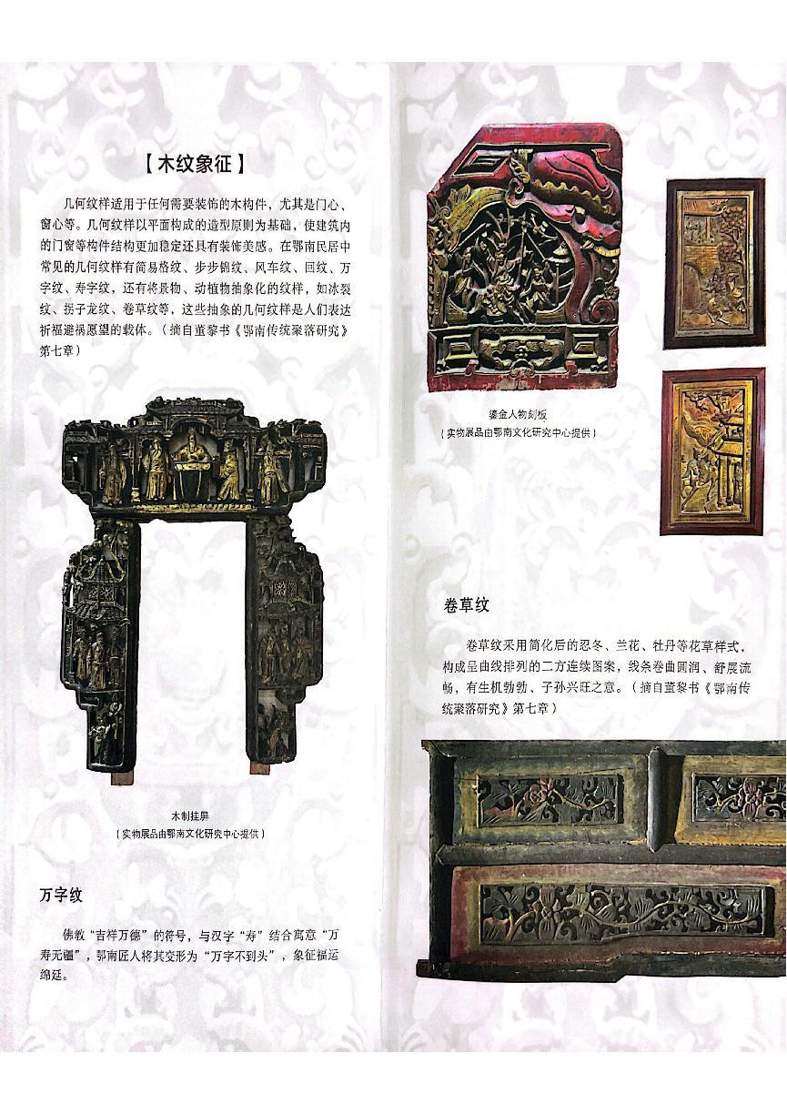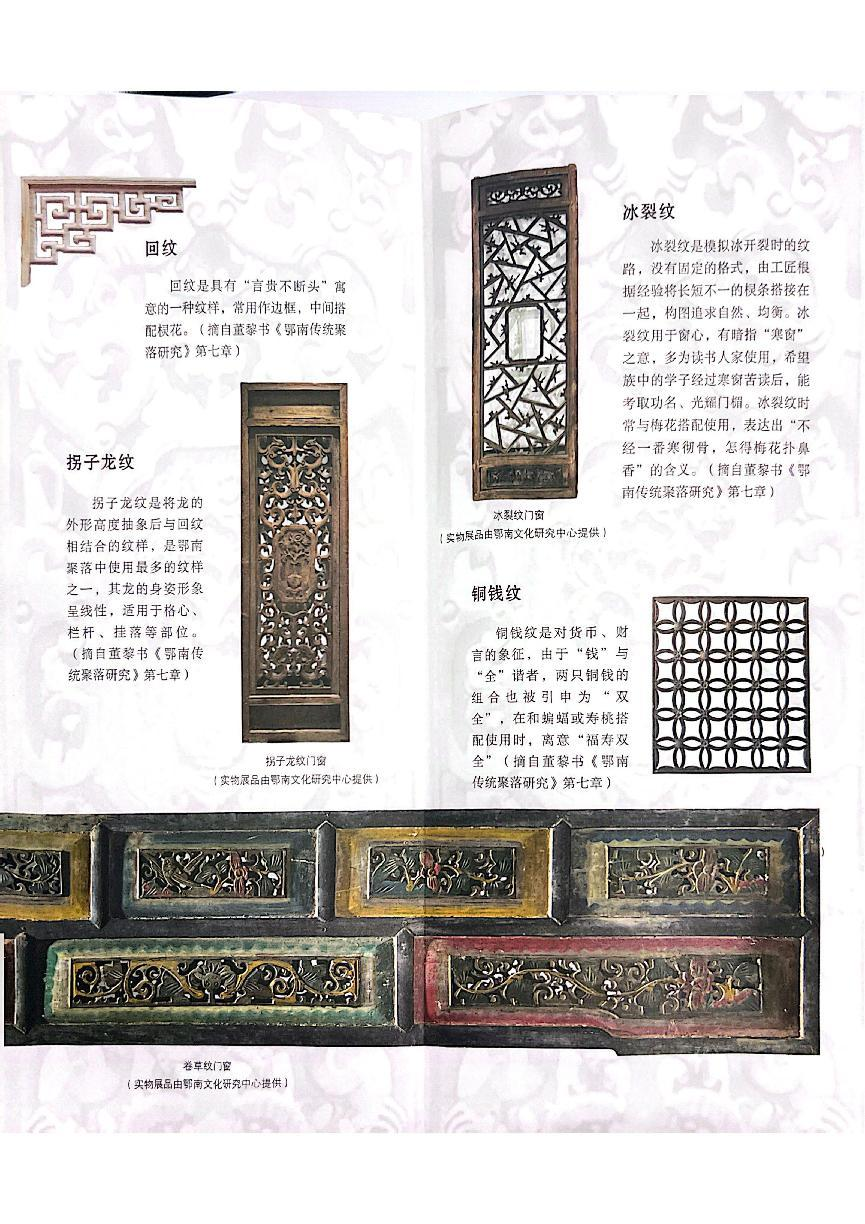 同时,木纹象征部分突出了鄂南民居的几何纹样,如万字纹、卷草纹和拐子龙纹。这些纹样不仅是装饰,更承载着祈福避祸的愿望。中心提供的木制挂屏展品,生动展示了拐子龙纹的抽象艺术,该纹样将龙形与回纹结合,适用于门窗等部位,象征福运绵延。此外,冰裂纹门窗展品由中心提供,体现了读书人家“寒窗苦读”的寓意,常与梅花搭配,表达“不经一番寒彻骨,怎得梅花扑鼻香”的求索精神。中心还展示了鎏金人物刻板等实物,这些展品凸显了移民文化(如江西“形势派”风水理论)对鄂南聚落选址的决定性影响,例如沈鸿宾故居的背山面水布局。