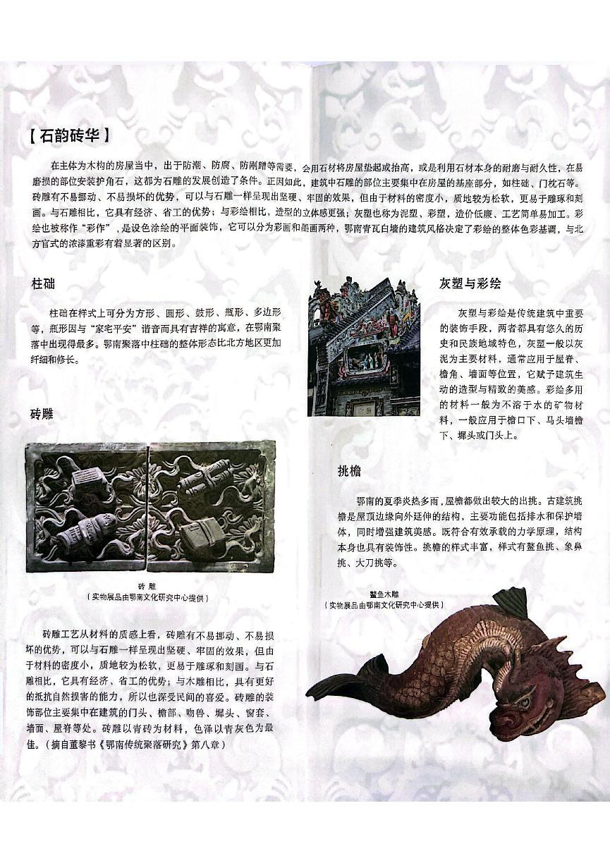 进入“匠造·纹章”板块,中心提供的实物展品成为亮点。木雕、石雕、砖雕作为鄂南建筑的重要装饰元素,尤其是砖雕以其经济、省工的优势深受民间喜爱。中心提供的砖雕展品,展示了其在门头、檐部等部位的精细工艺,青砖材质的粗犷与木雕的细腻相得益彰。
