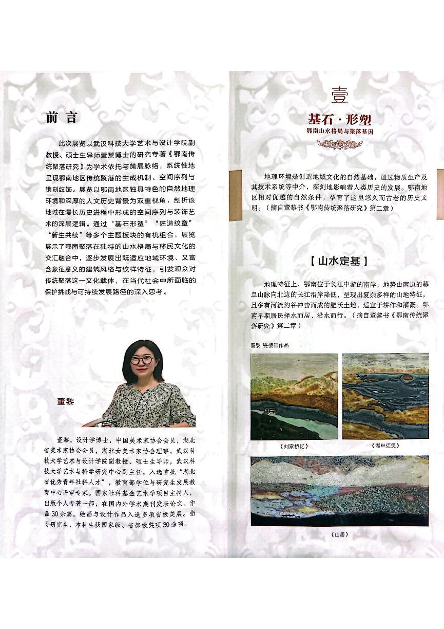在“基石·形塑”部分,展览聚焦鄂南山水格局与聚落基因。通过地理环境分析,强调了鄂南地区由幕阜山脉向长江沿岸过渡的地形特征,以及早期居民“择水而居”的生存智慧。董黎博士的研究指出:“地理环境是创造地域文化的自然基础,鄂南相对优越的自然条件孕育了悠久的历史文明。”这一板块还展出了董黎的瓷板画作品,如《刘家桥忆》和《山居》,艺术化地呈现了聚落与自然的和谐共生。